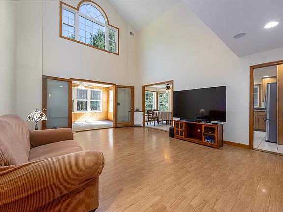 Cathedral ceilingWooded acreageCovered breezewayGenerously sized bedroomsEnclosed porchSpacious bedroomWrap-around porch