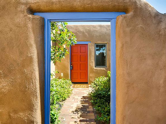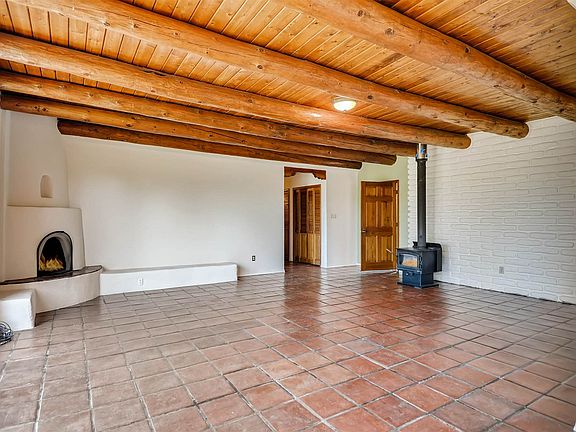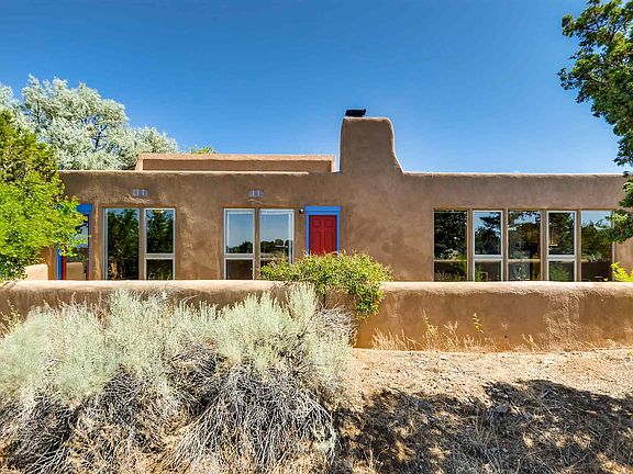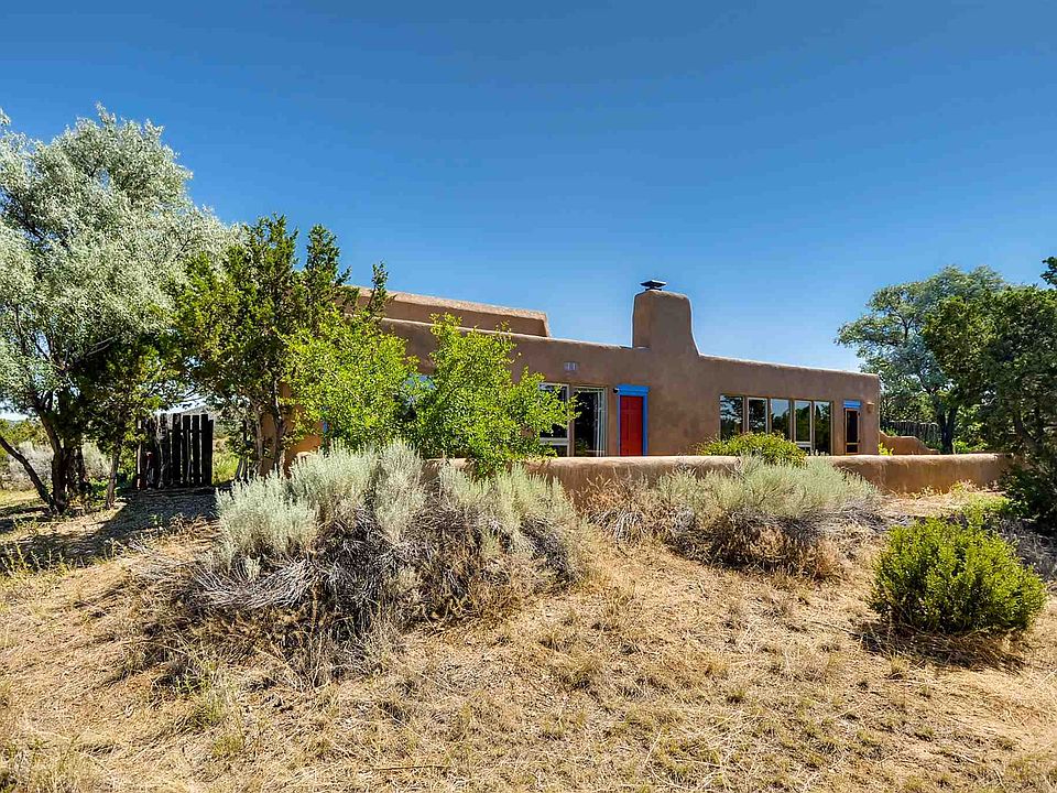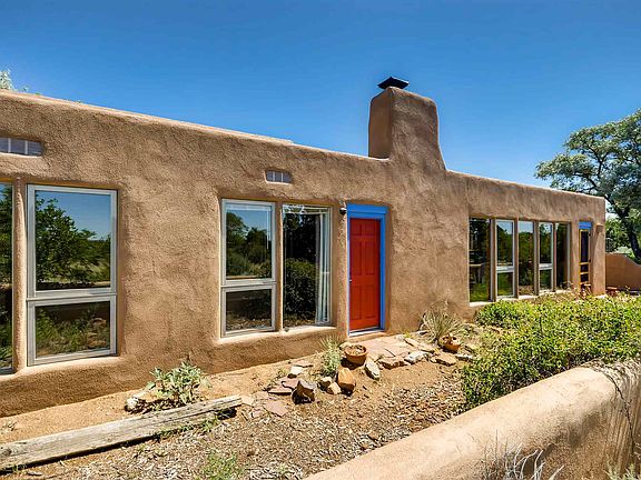 Sited well back from paved Verano Loop for privacy, with great mountain views front and back is this wonderfully treed and nicely landscaped 2340 sqft. home offering a very flexible floor plan on a 1.6 acre wide and deep 'greenbelt' lot. 2 or 3 bedrooms, 3 bathrooms that includes a studio/office with its own bathroom and kitchenette. Good separation from the main part of the house as this room has its own ingress/egress. Potential 3rd bedroom is large enough to be used as a family room, etc. Living/dining room with an adobe wall has a kiva fireplace, wood burning stove, and a separate adjoining kitchen. Both rooms have tile floors and viga ceilings with wood decking. Outdoor metal she. All appliance included. ECIA covenants will requires at least a 1-car garage.