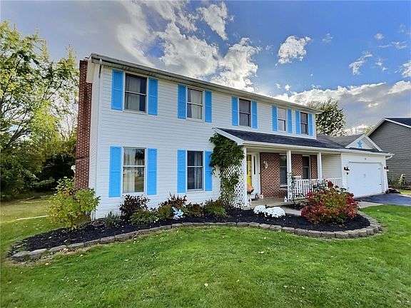 Welcome to your dream home in Churchville-Chili. Located on the end of a cul-de-sac street this home offers the perfect blend of modern comforts and timeless charm. This beautiful colonial style home offers 4 bedrooms and 3 full bathrooms. This home is over 2,200 sq. ft. offering ample living space. The kitchen features all stainless steel appliances, and a coffee bar. The 4 seasons sun room with cathedral ceilings is a bright and inviting space to enjoy daily. The owners suit features a walk in closet and a completely renovated bathroom that has a rainfall shower and a soaking tub. Outdoor living is a breeze with a new deck (hot tub hookup) to admire your tree lined backyard. The basement provides an entertainment area, workshop and a home office/workout room. Open house Saturday 21st 1-3