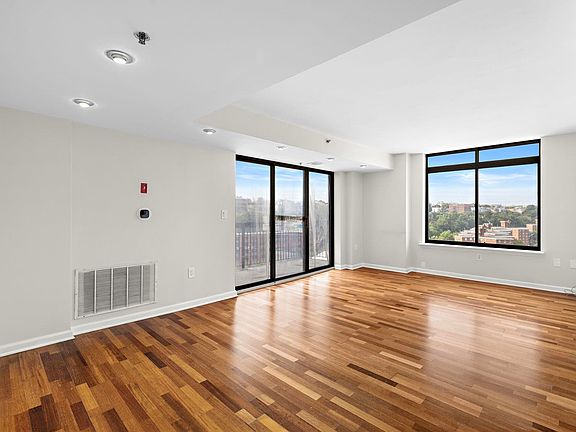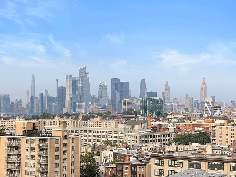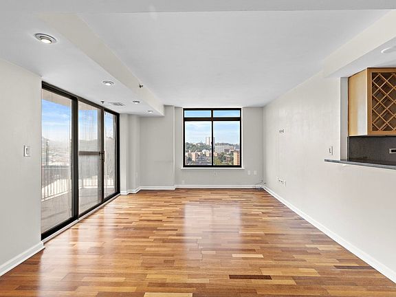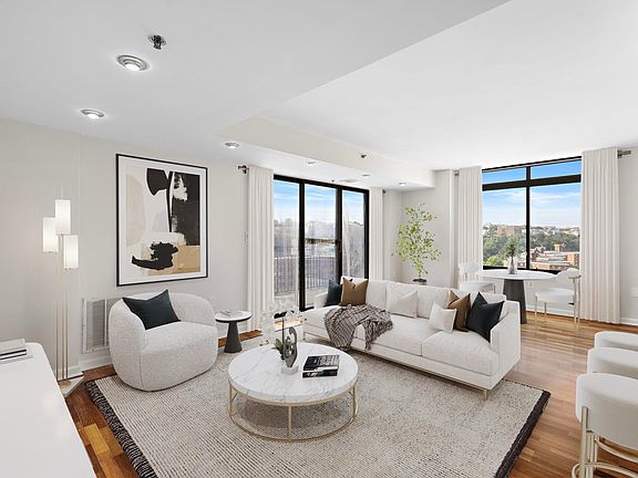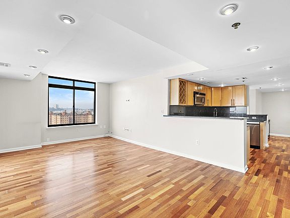 Welcome to this corner 2 bed, 2 bath home with a private balcony and NYC views located in the desirable Sky Club. This bright and sunny open floorplan has a chef's kitchen with stainless steel appliances, granite countertops, and a breakfast bar. The primary bedroom has an ensuite bath, and both beds have walk-in closets for maximum storage. Both bathrooms are newly renovated with modern finishes. The home also includes central AC, hardwood flooring, an in-unit washer/dryer, and a large terrace with NYC skyline views. The prestigious Sky Club building amenities include 24/7 concierge, elevator, and shuttle to the PATH. On-site garage parking, gym, and pool are available for an additional fee. Conveniently located near a light rail station, bus stops, and all the shops and restaurants that Hoboken has to offer. Move in ASAP.