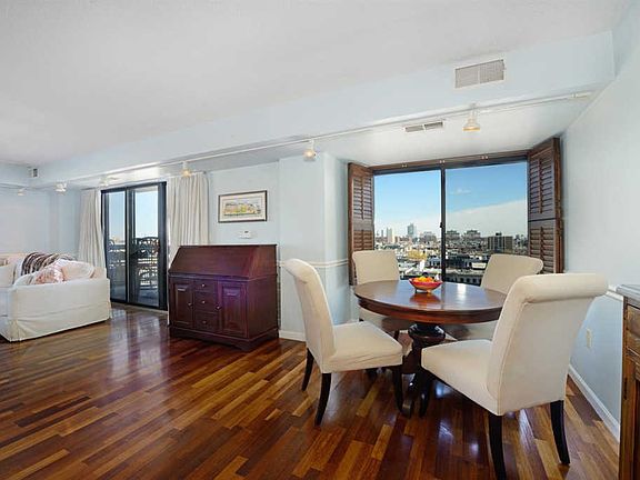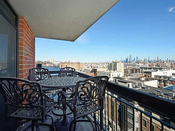 Wonderful fully upgraded 2 bed/2 bath sunny corner unit on the 10th floor in the Sky Club, a full service elevator building in downtown Hoboken. Enjoy NYC views from all the windows including the living room/dining room, kitchen, bedrooms and private balcony. Ideal for entertaining, the open kitchen / living room/dining area is flooded with light. Upgrades throughout: kitchen features granite countertops, updated back splash and stainless appliances featuring a double oven. Custom built in plantation shutters, upgraded washer/dryer, central air and heat, and hardwood floors throughout the living room/dining room. Master bedroom with his and her closets and ensuite bathroom. Spacious & bright second bedroom. Custom Hunter Douglas blinds in the bedrooms. Both bathrooms renovated - second large bath features a glass shower enclosure and double vanity. Building amenities include full-time concierge, shuttle bus to/from Hoboken PATH. For additional fee: attached garage parking and access to 25,000 sq. ft. gym/ huge pool; option for basement storage. Stunning new lobby just completed. Conveniently located 1 block from Light Rail, Southwest park, schools, multiple daycares, and restaurants. Onsite market and restaurant. Affordable luxury living in the heart of Hoboken.