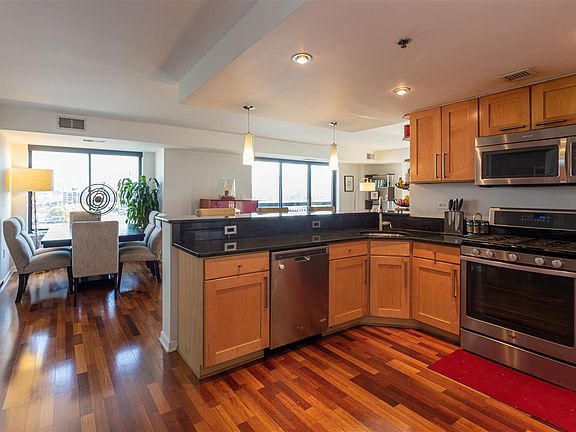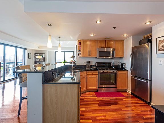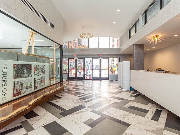 Desirable sun drenched south/east corner unit with full skyline views at the Sky Club!!! This is a 1268 sq. ft. 2 bedroom, 2 bath condo in a full service doorman building. This home features views from every room and balcony, open floor plan with a dining and living area, tons of natural sunlight, many updates including: newer stainless steel appliances, washer/dryer, home automation system (lights, custom blinds, HVAC, sensors and more), granite counters, updated baths, hardwood floors throughout, oversized ensuite master bedroom, etc. The building amenities include 24 hr staffed front desk, package room and complimentary shuttle to the PATH and ferry. Available parking, gym\spa on site for additional cost. Amazing home that will impress - this is a must see!!!