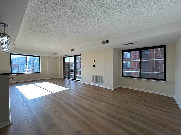 Welcome to this exceptionally bright and spacious 2-bedroom, 2-bathroom corner apartment at The Sky Club in Hoboken! Spanning over 1,200 sq ft, this south-facing unit boasts an open layout ideal for both entertaining and everyday living. Step into an updated interior featuring newer hardwood floors and a modern kitchen equipped with granite countertops, stainless steel appliances, a tile backsplash, and a convenient breakfast bar. The separate dining area flows seamlessly into a private terrace, offering partial city views perfect for morning coffee or evening relaxation. Additional highlights include an in-unit washer/dryer and a recently renovated primary bathroom. The Sky Club offers top-tier amenities such as a state-of-the-art gym with NYC skyline views, a year-round indoor swimming pool (available to residents at a discounted rate), and a complimentary shuttle service to the PATH. The lobby and hallways were renovated, enhancing the building's modern appeal. With four daycare centers on the block, this pet-friendly community truly feels like home. Nearby you'll find light rail access, buses to NYC, the Southwest Park, retail, and dining options.