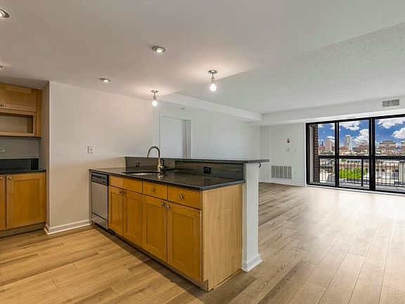 Experience stunning, unobstructed views of the NYC skyline from this beautifully updated 2-bedroom, 2-bathroom home in the sought-after full-service Sky Club. This spacious residence features an open-concept living and dining area that flows seamlessly onto a private balcony perfect for entertaining or unwinding with a view. (Some photos show original flooring, but floors throughout are updated) The modern kitchen boasts granite countertops, stainless steel appliances, and a convenient dishwasher and microwave. Both bedrooms are oversized with generous closet space, including a walk-in closet plus a 2nd closet in the primary suite. Additional highlights include in-unit washer/dryer, new wood floors throughout, and two updated full bathrooms. Enjoy top-notch amenities including 24-hour concierge, a resident shuttle to/from the PATH, on-site garage parking for an add'l fee, and access to a 25,000 sq ft gym with pool (membership optional). Ideally located near transportation, light rail, parks, schools, daycare centers, and everything Hoboken has to offer.