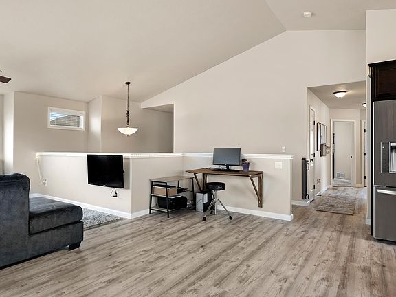 This is a beautiful must see home! The moment you walk inside you will notice the high vaulted ceilings. The main floor has a large open living room, dining area and kitchen all with newly installed life proof vinyl plank flooring. The floor plan is open with a patio door off the kitchen leading to a large deck. The kitchen boasts lots of cupboard space, stainless steel appliances and an island for informal seating. There are windows throughout for plenty of natural light. Going down the hall you will find a guest bathroom with three bedrooms. The primary bedroom fits a king sized bed with an en suite bathroom and walk-in closet. Downstairs is also large and open with a newly added dry bar and generous sized living area. There is also a walk out patio leading to a HUGE private, fenced yard with a basketball hoop and raised garden beds. Back inside you will find a laundry room, bathroom and two more bedrooms. This is truly a must see home! Call your favorite realtor for a tour today.