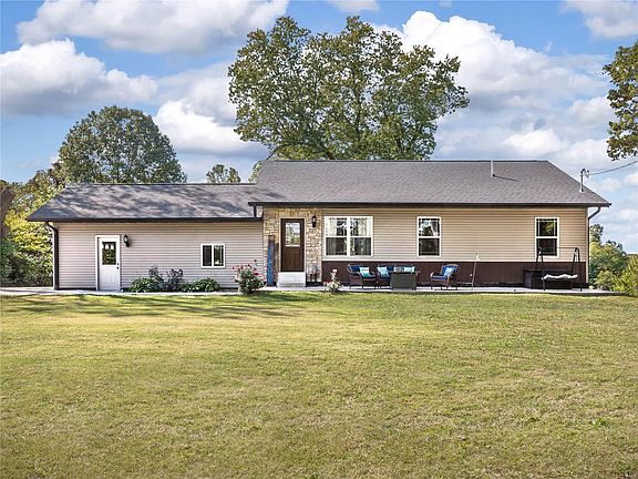This home is only 5 years old and sits on a well cared for partially wooded 2.5 acres that has a bonus of all being fenced in. The home has an open floor plan with cathedral ceilings and a large deck off the back to enjoy the sunsets and get-togethers. Primary bedroom has a walk-through closet that leads to the primary bath with soaking tub and separate shower (mirror over sink in primary bath doesn't stay). The lower level has a 3rd bedroom, full bath, excercise area and large family room. The basement is a walkout and there is a large patio off the lower level. This property is located at the end of a dead-in-street and just off Route 159. Enjoy the country but close to conveniences. There is a brick shed for storage and an additional shed they use for a chicken coop. Bring your toys and enjoy activities on the paths that the seller has cleared through the woods!!