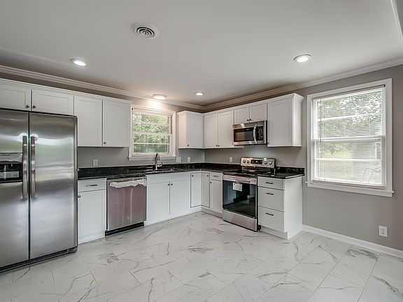 Renovated brick home on over a half acre with a fenced in yard, mature trees and located at the end of a cul-de-sac! Walkable to both elementary and middle school! This house has a brand new kitchen with stainless steel appliances, tile flooring, new cabinets, and granite countertops! The entire house has updated lighting, been freshly painted inside and out, new flooring downstairs and refinished hardwoods upstairs! The home also features a 1 car garage and 2 car carport!