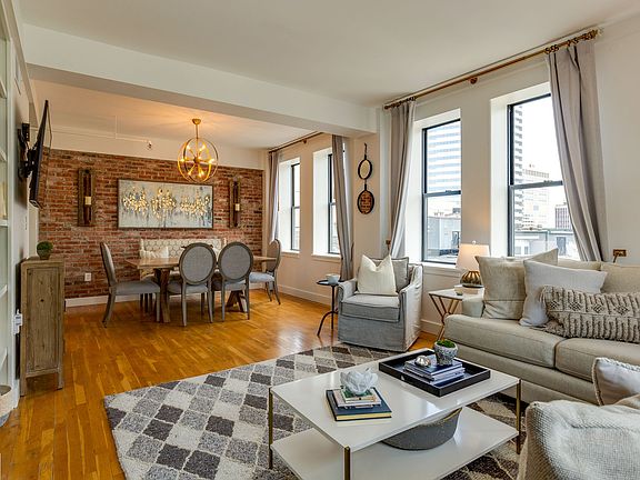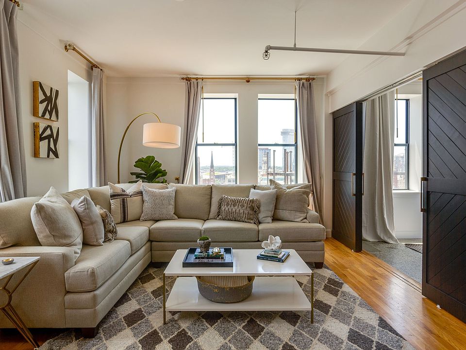 Historic Bennie Dillon Condo CORNER UNIT HIGH END renovation: Recessed lights, all new lighting, tile backsplash, new countertops, custom barn doors, remote black out shades, custom book case w glass backing, wallpaper accent wall, tile shower, frameless shower door, new vanity, tile accent wall + storage unit across the hall.