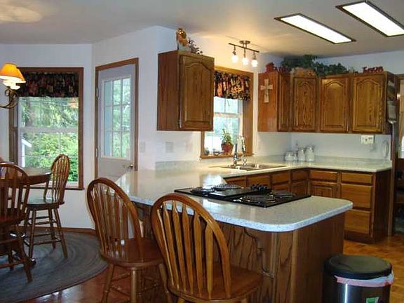 Cape Cod design with wrap-around covered porch & curb appeal from every angle! Abundant pride of ownership throughout with numerous upgrades. Master suite is located downstairs with travertine floor, walk-in closet. Kitchen features include solid surface counter-tops, dark oak cabinetry, breakfast bar & nook with access to covered porch. 896 sq ft shop and 552 sq ft detached RV garage, play house, storage shed, asphalt driveway and natural landscape. Private setting -