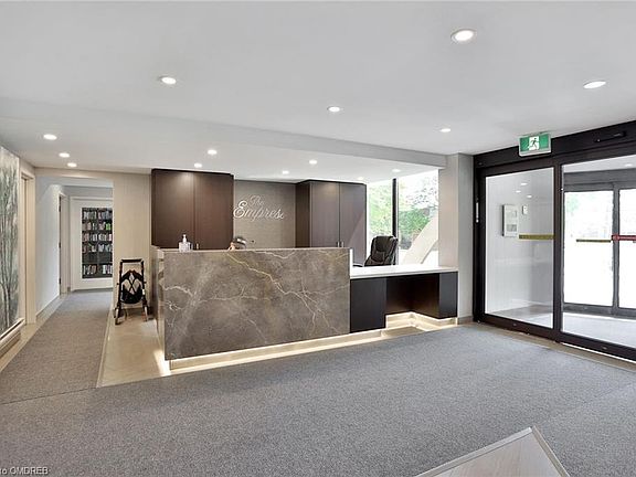 Beautiful and spacious one bed, one bath, condo unit of approximately 1074 sq.ft, in prime location opposite Burlington Mall. Located at the end of the hall with windows on both sides of the unit allowing lots of natural light, and views of great sunrises and sunsets. The suite offers a large open concept living room/dining room, with a walkout to a spacious balcony, large bedroom with lots of closet space (and closet organizers), a den off the kitchen, large storage room, separate laundry room, and a 4 piece bathroom. The underground parking space is owned, and located close to the building entrance. Amenities at "The Empress" include an outdoor pool, 24 hour concierge/security services, library and hobby room. New amenities (gym, party room) are presently under construction, and the building entrance and foyer have been recently renovated.