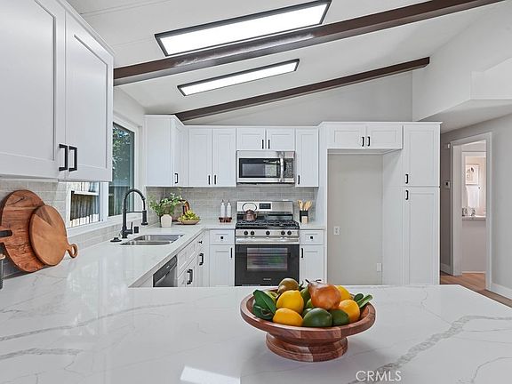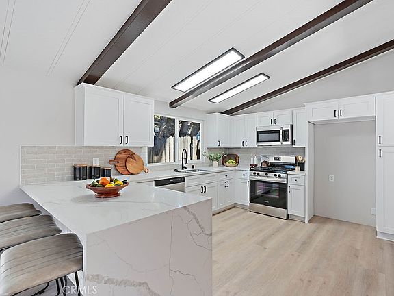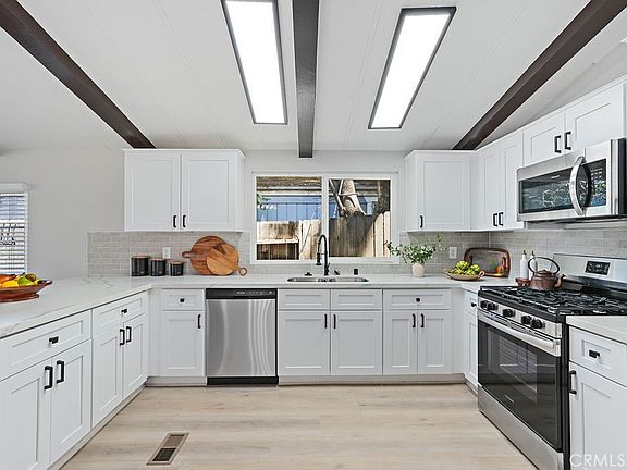 Beautiful completely remodeled manufactured home and you also own the land. Low hoa and tax rate make this a great buy with one of the lowest priced properties around and completely turnkey. The home has all new interior and exterior paint, new landscaping. The interior features newer dual pane windows, Large open kitchen with pretty new white shaker cabinets and waterfalled bar overhang, with quartz counters, new stainless-steel appliances. Pretty new wood look spc flooring throughout and plush new carpets in the bedrooms, Large indoor laundry room, vaulted ceilings with accent beams make the home feel large and open. bathrooms have been refinished with new vanities and quartz counters. new interior doors, baseboards, fixtures. The home has a new roof and a large backyard with a covered patio that leads to your two car garage. Hurry before this one is gone!!