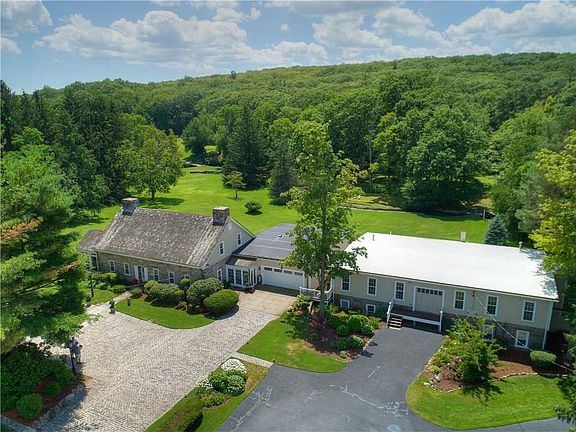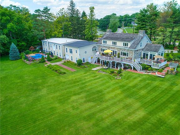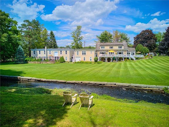 This is a home for the ages - both remarkable in style and fabulous in function. This house is perfect for a multi - generational clan that will love being home. The two separate in law or au-pair suites make this a truly exceptional layout...one on the main living level and one utilizing the lower level with a full walkout. With both a work from home space, or work next to home space, the superb functionality of this property along with the mixed use zoning, allows for endless possibilities. The main level offers both master bed suite and in law suite, a laundry room, a well-appointed office/library, a tranquil sunroom with a separate entrance and spectacular views, a formal living with a gas fireplace and great room with built-ins and a fireplace, a dining room, a gourmet kitchen with coffee bar and a five burner stove and double ovens! Surrounding this level is a wrap-around deck overlooking the gorgeous views of the 16+ acre parcel with trout fed river and stone walls. On the second floor two bedrooms - each with their own private sitting/study area share a bath. The lower level offers another full in law suite with kitchen, bed, bath, and fireplaced living room which walks out to beautiful gardens and in ground pool and patio. Additional features include stone construction, 5-6 car garage, a huge space currently used as an artist studio, brand new gas heat, central air, city water and sewer. Space, style, function and privacy--this home has it all!