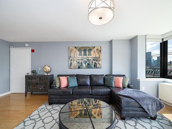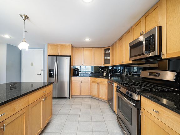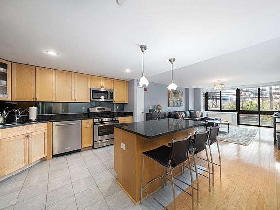 This immaculately maintained south-facing residence boasts 2 bedrooms and 2 bathrooms, encompassing 1266 square feet. Flooded with natural light, it offers a well-designed layout with a generous living/dining area, an open kitchen with an island and upgraded appliances including newer refrigerator and washer/dryer. Both bedrooms positioned on opposite ends for privacy. Numerous upgrades include custom window treatments, built-in closets, and fully renovated bathrooms. includes an indoor garage parking space. Maintenance fees cover a range of amenities such as heat, hot water, basic cable, internet, and cooking gas. Residents also enjoy access to a Hoboken PATH shuttle service, 24-hour concierge, fitness center, and communal courtyards with BBQ grills. Conveniently situated near supermarkets, parks, restaurants, shops, and major transportation arteries including the Holland Tunnel, I-78, Route 1/9, and the NJ Turnpike.