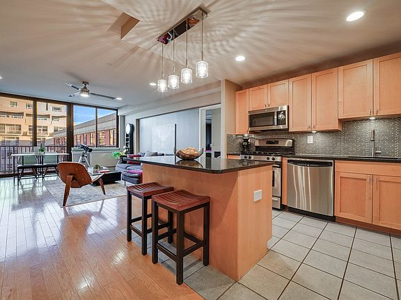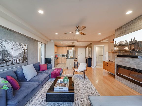RARE OPPORTUNITY! Impeccable penthouse level 1373 sq.ft. A-line 2 bedroom/2 bath unit with large terrace and 1 fully-covered deeded parking space. This RECENTLY RENOVATED Toll Brothers concrete and steel construction unit is filled with natural light and features a generous primary suite that includes a large walk-in closet, fully renovated bathroom and vanity counter. Second bathroom is also fully renovated. The condo boasts high ceilings, natural oak wood flooring, custom closets, and fabulous view of the NYC skyline, including prominent views of the Empire State building from each room. Open kitchen with breakfast island, granite countertops, pendant lighting, shaker style cabinets, and brand new appliances. Living room features a travertine ceramic fireplace wall, built-in cabinets, floating shelves and an electric fireplace. Washer/dryer in unit and new in 2019. New PTAC heating and cooling units were installed in each room, along with Nest Learning Thermostats. 700 Grove building amenities include a fully-equipped, recently renovated gym, 24-hour front desk, shuttle, well-maintained courtyard and community room. The building’s lobby and hallway redesign is underway, already budgeted and will not have an impact on HOA dues. Enjoy luxury living just steps away from the new Southwest Park and Southwest Market! Maintenance includes heat, gas, water, cable TV and internet.