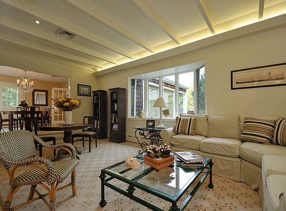 Easy and comfortable living. A one-level Ranch with open floor plan, bright and sunny. Kitchen with new appliances and spacious eat in area. Step down living room, bay window and floor to ceiling stone fireplace. Large great room with walls of windows overlooking property. Master bedroom with built ins. Wrap-around deck with beautiful pond views for year-round enjoyment. Conveniently located, minutes to town center.