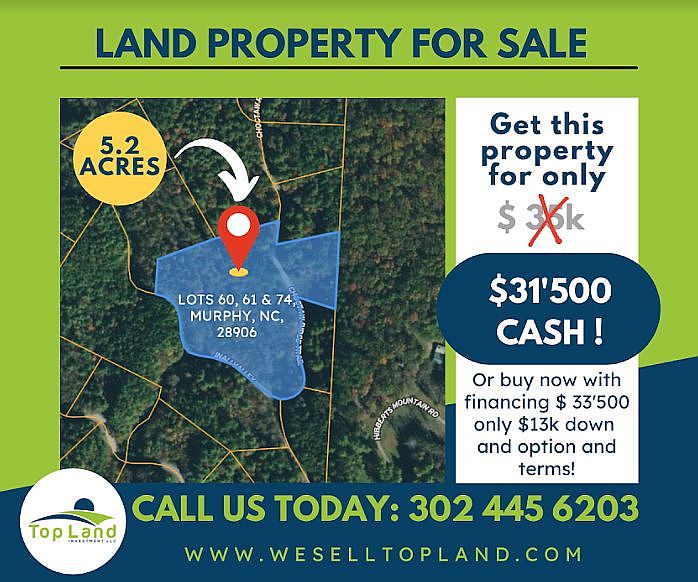 Set aside stress and come enjoy life while listening to the chirps of the bird, and feel the cozy breeze of the mountain air in this vast 5.2-acre covered with verdant landscapes that makes this place extra special. Accessed via Choctaw Ridgetrail, and about 14.8 miles east of outskirt Murphy. If you are a fan of peaceful and forestry homesites for your retirement, this offer is perfect for you. The quaint downtown has restaurants, many unique shops, and other interesting establishments all within walking distance in the heart of town. Murphy also offers something for every sports enthusiast.If you are looking for a beautiful small town in the mountains, look no further. What are you waiting for? Call us now! Pricing Details: Cash Price: $31,500 Property Details: Parcel Number: 454200889306000 County: Cherokee County Parcel Size: 5.2 acres State: NC City: MURPHY Zip Code: 28906 GPS Center Coordinates: 35.090300, -84.187700 GPS Coordinates (Corners): 35.090401, -84.187099 35.090297, -84.187054 35.090156, -84.187032 35.090025, -84.187067 35.089929, -84.187118 35.089772, -84.187143 35.089602, -84.187102 35.089532, -84.187169 35.089503, -84.187303 35.089558, -84.187478 35.089803, -84.187800 35.089900, -84.188103 35.089900, -84.188298 35.089973, -84.188400 35.090182, -84.188400 35.090304, -84.188499 35.090401, -84.188700 35.090803, -84.188703 35.090999, -84.187995 35.091101, -84.187300 35.090900, -84.187303 35.091001, -84.186595 35.090302, -84.186700 Elevation: 1755.2 ft Property Access: Paved
