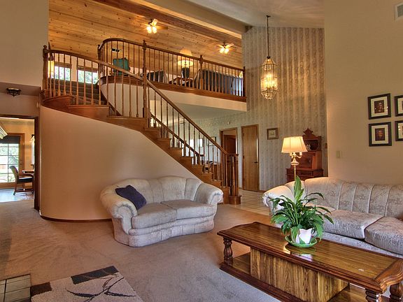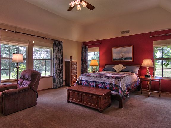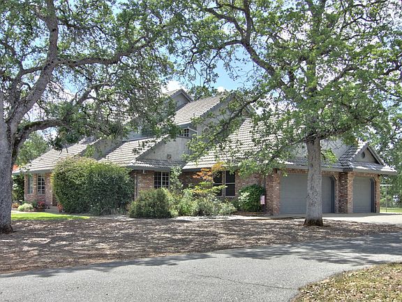 A private beautiful hilltop home with panoramic and lake views perfectly situated a half-mile off the road on twenty acres of majestically rolling hills with lovely oaks and protected-orchard fruit trees; great for entertaining, this two-story home has 3-5 bedrooms, 4 baths, large family room, formal dining room, den/study, home-office area, living room, 3-car garage with recreational parking for boat, RV access, RV storage, and a separate garage with handyman-workshop building.