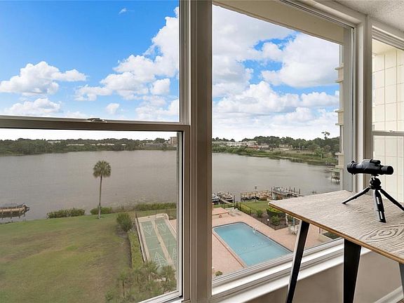 Best view in the building! Welcome to your dream Florida escape at 700 Mirror Terrace NW, a beautifully updated and well-maintained condo in this lively 55+ Spring Lake Towers Community. This stunning unit boasts unparalleled lakefront views on the Chain of Lakes in Winter Haven, offering breathtaking sunrises and sunsets every day. Step inside and discover a spacious living and dining room. The large primary bedroom has a walk-in closet leading to a sunroom, creating a versatile space for relaxation or hobbies. Newer oversized windows throughout the unit bathe the living area in natural light, further enhancing the spectacular lake views... Live an active lifestyle with sparkling swimming pool directly on the lake well-equipped fitness center, shuffleboard court, recreation room and library. On-site laundry facilities are available for residents. This condo is perfect for full-time residents seeking a tranquil lakeside retreat or snowbirds desiring an affordable winter getaway. Those seeking a low-maintenance lifestyle with condo fees covering water, sewer, trash, cable, internet, and all exterior maintenance. Additional highlights include a single covered parking spot, a dock for fishing or viewing the water, boat slips available on a first-come, first-served basis. Enjoy planned social events and activities for residents. No pets or smoking allowed. Winter Haven's central location provides easy access to theme parks like Orlando and Tampa Downtown area Grocery stores, shopping, movie theaters, restaurants and medical facilities, making this a prime location. Don't miss this extraordinary opportunity to own a piece of paradise. Escape to the tranquility, luxury, and with expansive water views where every day feels like a vacation.
