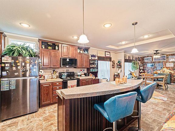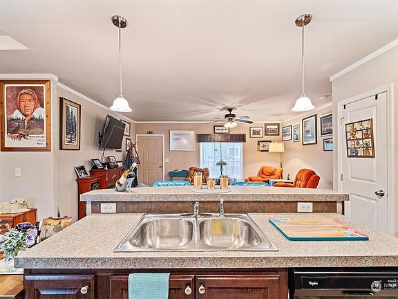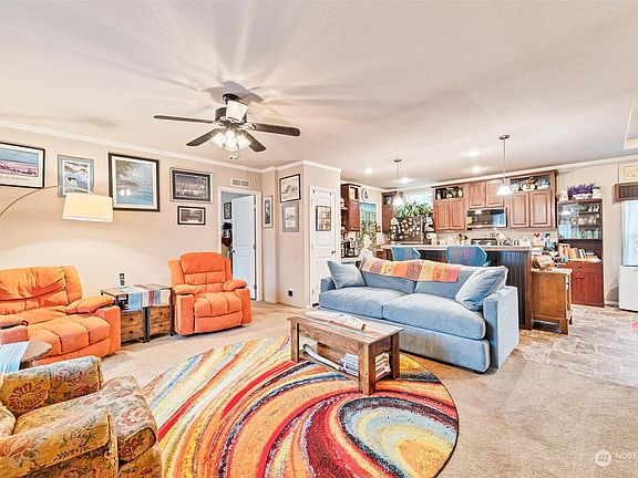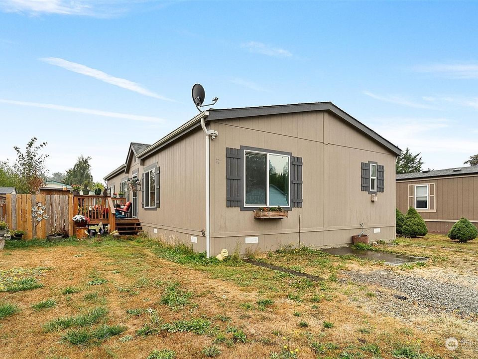 Welcome to this 2014-built, 3-bedroom, 2-bath double-wide manufactured home spans 1,512 sqft with an open layout. Step onto the new deck and into the spacious family room. A bonus living space adjacent to the dining area enhances entertainment possibilities. The kitchen showcases newer appliances, such as the stove, refrigerator, and microwave, that stay! Discover the expansive primary suite, boasting a large tub, double sinks, and a walk-in closet. Enjoy comfort with the included Nest thermostat. Outside, a fenced yard, storage shed, and plenty of parking space. Situated in an all-ages community, relish easy access to amenities and transit. A monthly $773 space rent. Your new home journey begins here.