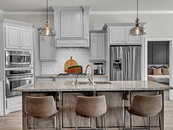 Gourmet Eat-In Kitchen: A chef’s dream, featuring spacious countertops with elegant granite surfaces and a beautiful white tile backsplash. The eat-in kitchen offers plenty of room for family meals or entertaining guests.