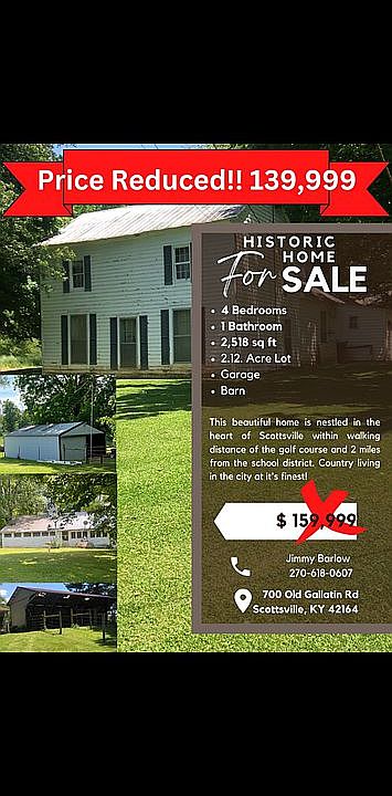 Major Price Reduction!!!! Historic Home in Scottsville 4 Bedrooms 1 Bath 2518 sq ft Sitting on a beautiful 2.12 acres lot Nice Garage Nice barn. Country Living in the City Within 2 miles to school district Walking distance to the golf course Within miles of Barren River. Call or text 270-618-0607