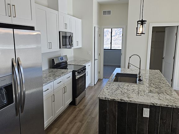Stainless appliancesGranite countersLarge kitchen islandStorage unit
