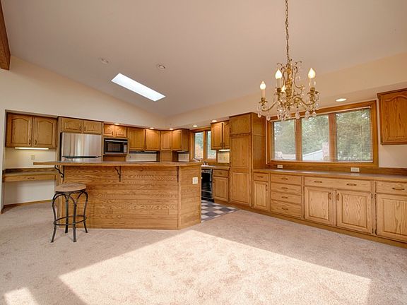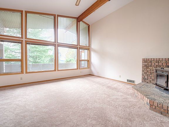 Distinctively NW! Over 3000 sq. feet: 4 bedrooms, 3 baths, soaring ceilings & skylights. Prominent wood windows & handsome timbers unite the living, kitchen and dining areas. Enjoy morning coffee on this covered deck! The main level has 1800 feet of totally flat area for living area, master suite, 2 baths, den (or bedroom), utility room, garage. Comfortable family room, 3 large bedrooms, full bath, large storage, & covered deck below. Great quality, perfectly clean! Open photos for more info.