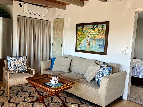 Experience Coastal Living at its Finest! Welcome to your perfect sanctuary in the heart of Encinitas, California. Nestled just one mile from the beach, this one-bedroom, one-bath cottage offers an excellent coastal lifestyle. This is a split home with two units, one in the front and this unit in the back with an expansive sunset view and garden/yard while offering total privacy. Beachside Bliss Location: Enjoy the beach, yoga, restaurants and San Diego Botanical Gardens a short distance away. Just off Encinitas Blvd with a quick, easy access to the freeway and El Camino Real. Features: Windows across all of back wall West facing, sunset views to undeveloped land Covered patio, fully fenced yard with an ocean breeze. Artificial turf. Four level terraced garden with surrounding mature trees New light wood driftwood LVP flooring New laundry room with stacked washer and dryer. New air conditioning/heating splitter unit Remodeled Kitchen Open beam tongue and groove wood ceiling Fresh paint New lighting fixtures Mirrored sliding doors in bedroom Solar tube skylight Designated parking space for off street parking. Space for at home working desk. Walking and hiking trails in neighborhood Located on quiet cul-de-sac Not an Apartment! Enjoy the freedom and privacy of a home. This is your chance to savor the perks of a house, with the convenience of a rental in a charming cul-de-sac neighborhood. One person preferred. Small, quiet dogs/cats welcome. Private fenced in yard. Fully Furnished saving you the hassle and cost of furnishing your home: Great room: sofa, coffee table, rug, artwork, lounge chair, desk, desk chair, dining chairs. Kitchen: complete with plates, silverware, glassware, cooking ware. Pantry. Bedroom: queen bed, nightstands, lamps, dresser, lounge chair, side table. Unfurnished option available. All-Inclusive Rent: Simplify your life with a monthly rent of $3800.00. Includes: Gas and electric Internet Trash pick-up Water Gardener. Say goodbye to multiple bills and hello to stress-free living. Renter would need a PO Box for mail. All-Inclusive Rent: Simplify your life with a monthly rent of $3800.00. Owner pays for: Gas and electric Internet Trash pick-up Water Gardener. This is a split home with two units, one in the front and this unit in the back with an expansive sunset view and garden/yard while offering total privacy.