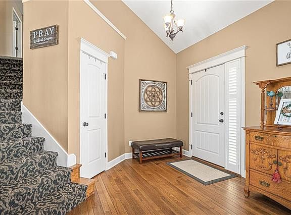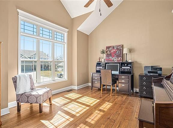 Stunning home in Greyhawke! NEW carpet & paint. Open floor plan w/ sitting room off the entryway & large front-facing windows. The eat-in kitchen is equipped w/ s/s appliances, hardwood floors, brkfst bar, walk-in pantry, custom cabinets, granite counters & dining area. Living room boasts custom built-in cabinets, fireplace & floor to ceiling windows overlooking the private green space. Master suite w/ vaulted ceiling, dbl vanity, jetted tub & walk-in closet. Finished basement w/ built-in speakers & flat screen tv!