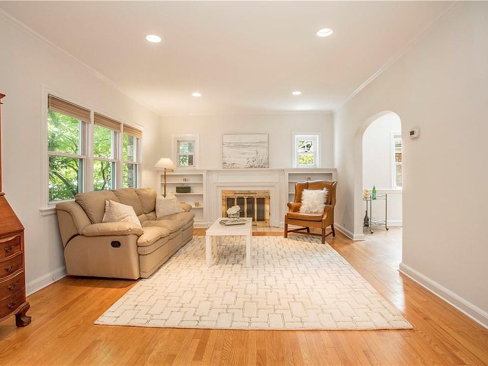 - Description: FIRST FLOOR: Exterior stone walkway to landing, Vestibule with coat closet, Living room with three windows, built-ins, and fireplace, Formal dining room with archway, three windows, & built-ins, Kitchen with stainless steel appliances, breakfast nook, & door to back deck/yard, Powder room & Access to single car attached garage