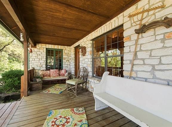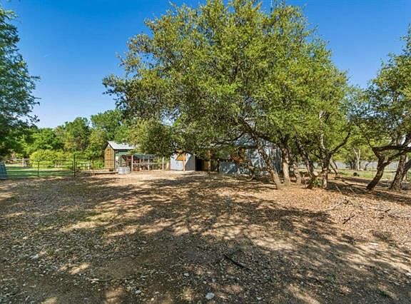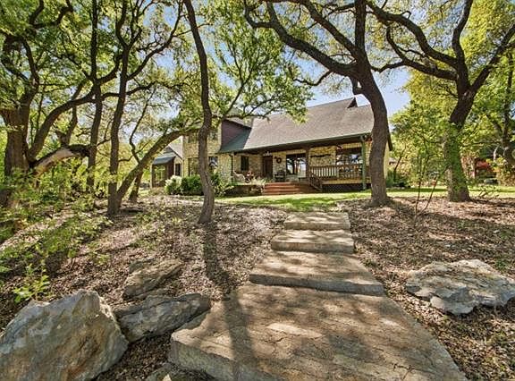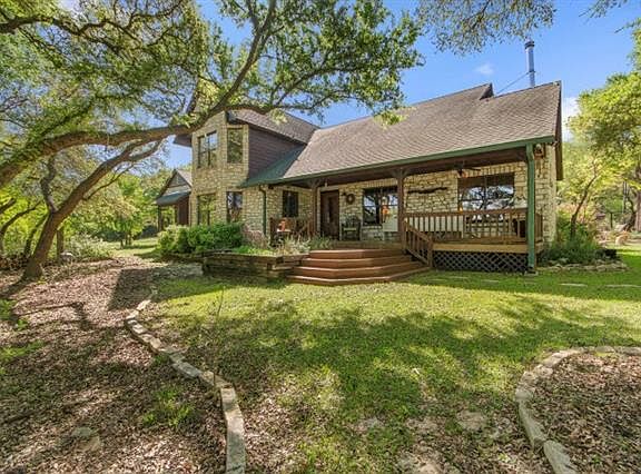 This mini ranch will amaze! Private setting with shaded drive to home. Stone and wood home in the middle of Oak trees w/ front porch. 4 or 5 Beds. 4 baths, painted mexican tile and basins. Pine detail throughout with beamed ceiling in kitchen and family room. Wood burning stove, high ceilings, updated kitchen with over 3600sqft. Master on main with laundry room. Detached garage with gameroom or study above. Barn, fenced, chicken coop, storage, sitting areas, pathways. Listen to quiet! 10.3 acres. 2 living