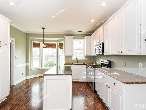 This Raleigh home offers kitchen granite countertops, a kitchen island, master bedroom walk-in closet, and a two-car garage. Fireplace and chimney to convey as-is, no known defects. Windows with possible blown seals to convey as-is.