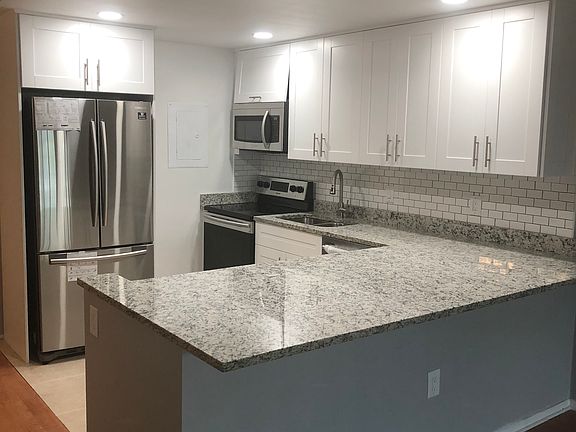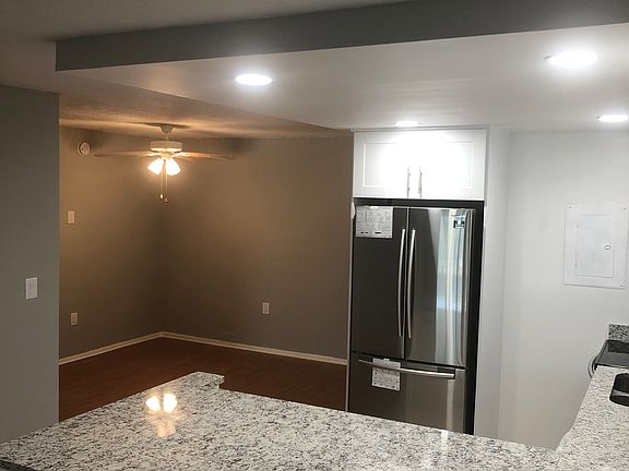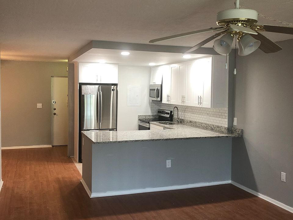 Total remodeled 1 bedroom: 1 & 1/2 bath. New vanities, toilets, mirrors, sinks, bathtub all tiled throughout. Samsung appliances in kitchen. Brand new soft closing cabinets, granite countertops, extended counter top allows sitting too. Floors are newly tiled in bathrooms and kitchen. Carpet in bedroom with fan and Queen bedroom set. Laminate floors in dining room and family room. Enclosed patio as well.