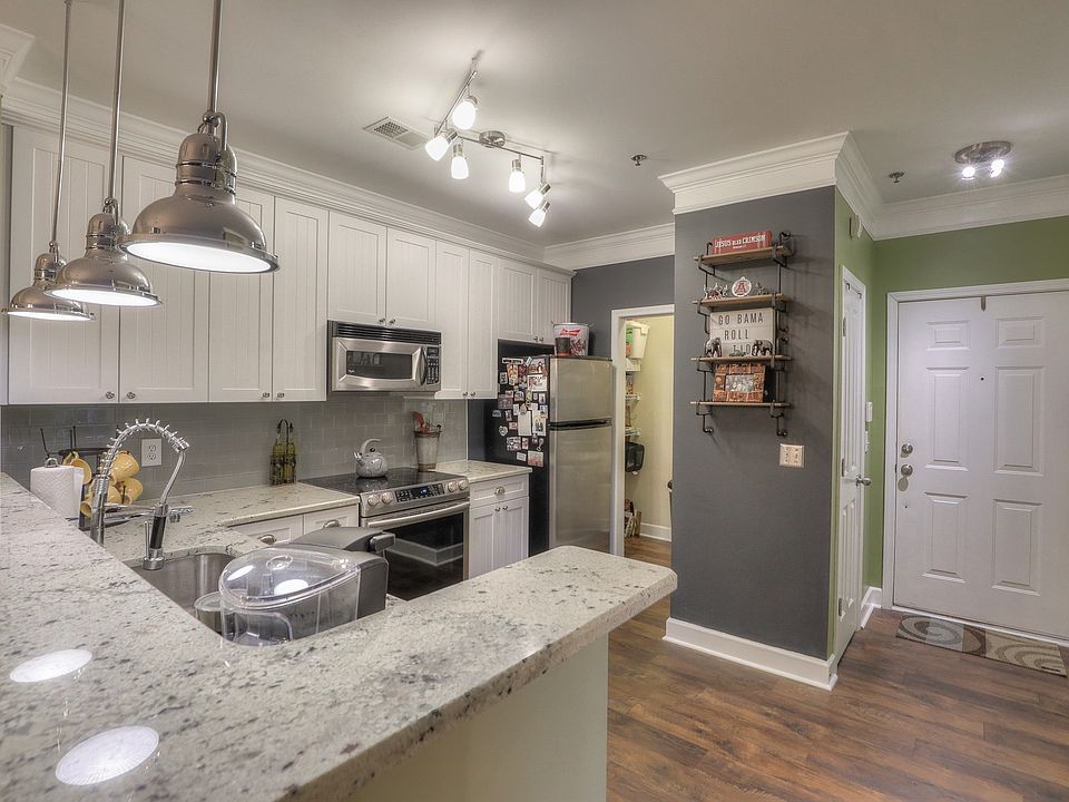 We saved you the trouble of updating. Rich wide-board hardwood floors. Dining room with wet bar & small beverage cooler. High end kitchen stove/oven, stylish subway tile backsplash & beautiful granite counter tops. New lighting fixtures & chandelier throughout. New toilets, bathroom faucets & granite counter tops. Cozy covered deck. Primary bedroom includes sliding door to covered deck. Dedicated parking space #10. Open visitor parking. Wonderful walking community with restaurant & retail conveniences. Nolensville Road in process of being widened.