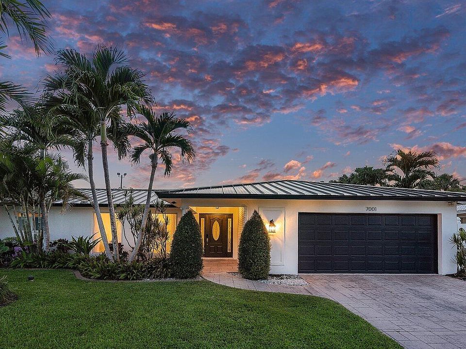 Why choose between the benefits of Boca Raton and Delray Beach when you can enjoy both from the comfort of one of South Florida's best hidden-gem neighborhoods? Located in Northeast Boca Raton just south of the city's border with Delray Beach, this Boca Harbour residence offers the incredible opportunity to own a property surrounded by 7-figure homes in a prosperous neighborhood. Comprising 3 bedrooms and 2 bathrooms across 1,835 square feet, the turnkey home at 7001 NE 7th Avenue is newly renovated and perfect for enjoying the best of southern Palm Beach County. After being greeted by a meticulously landscaped front yard and making one's way inside through the home's covered entryway, visitors are greeted by a spacious family room that's bathed in natural light from the front of the home. Moving further inside, the newly redone kitchen glistens with marble countertops, tile backsplash, pendant lighting, Frigidaire appliances, and a separate bar with an undercounter beverage cooler. The kitchen's peninsula provides seating for two and overlooks a cozy dining area which opens directly to the backyard via glass sliders. The home's outdoor spaces include a spacious covered patio area with travertine tile that's perfect for al fresco dining, along with a large turf area with ample space for recreation, sunbathing, or even eventually adding a pool.