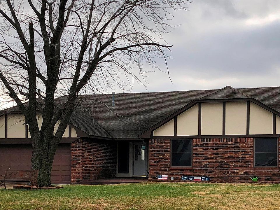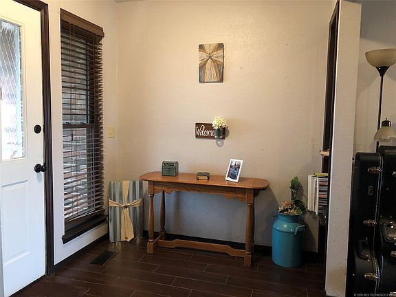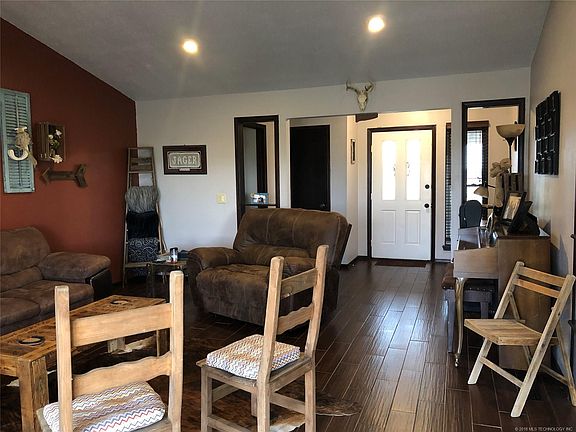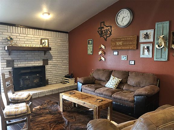 South of Muskogee 3 acres m/l, clean well maintained full brick home! 3 bed/2 bath/2 car garage w/shop & barn at end of street surrounded by open acreage. Granite counters, tiled wood look flooring, SS appliances, blinds, slider to back patio, fireplace.