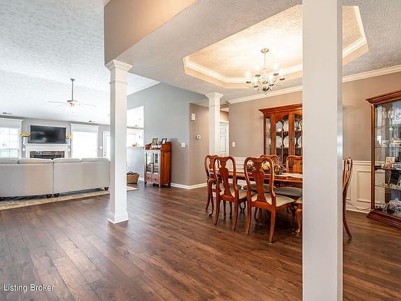Welcome to a beautiful and meticulously maintained split-bedroom ranch in the heart of Crestwood. This popular floorplan in Williamsgate incorporates one level living and a light filled, open concept family room, formal dining room and kitchen. The family room has a vaulted ceiling and hosts a gas fireplace flanked by tall windows. The kitchen includes a tile backsplash, white cabinetry, stainless appliances, a pantry and a window lined breakfast area. The formal dining room includes crown molding, a trey ceiling and the office/den offers a palladium window and glass double doors. Both rooms have wainscoting and are located off of the foyer. The newer flooring in all of the gathering spaces is the perfect addition and it flows seamlessly. The primary suite has a double trey ceiling , a separate bath and shower, a double vanity and a walk-in closet. The secondary bedroom wing features two bedrooms and a full bath and one of the bedrooms is being utilized as a work-out room. The laundry/mud room is conveniently located off of the two-car garage hosting attic storage. The outdoor entertaining areas feature a front sitting porch overlooking a large landscape area and a flat back yard with an extended patio. The highly desirable location in Oldham County is in close proximity to award-winning schools, restaurants, stores, gardens and parks. The 22 acres of Maples Park is across the street from the neighborhood and offers walking and mulch trails, a playground, a spray ground, a shade pavilion and a community event space.
