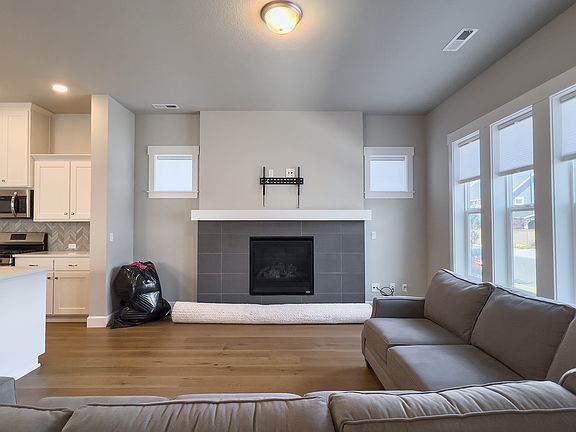 As you arrive, you're greeted by a beautiful front lawn and covered entryway that create a welcoming first impression. Inside, the open-concept floor plan provides an inviting and inclusive feel, perfect for both relaxing and entertaining. The living room features engineered hardwood flooring, a cozy fireplace, and three tall windows overlooking the front lawn, filling the space with natural light.