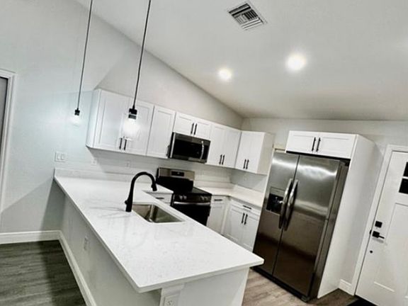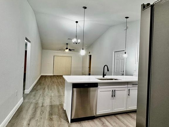 "Experience modern living in this stunning brand-new duplex! This charming 3-bedroom, 2-bathroom retreat in a quiet neighborhood offers the perfect blend of comfort and privacy. - Open floor plan with cathedral ceilings - Vinyl plank floors throughout - Modern kitchen with stainless steel appliances and quartz countertops - 1-car garage and spacious driveway parking - In-unit washer and dryer for added convenience - Expansive backyard perfect for entertaining Located near HWY