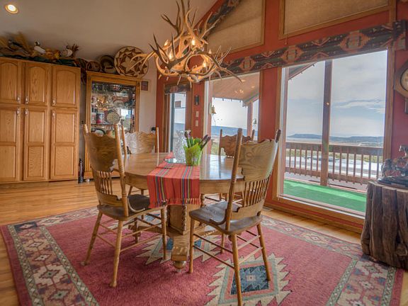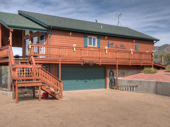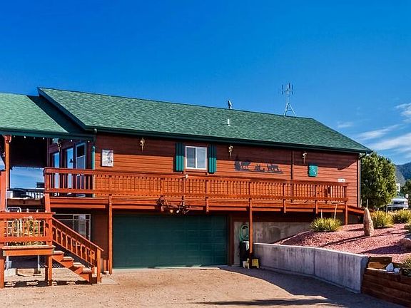 Custom built home features an open floor plan w/ vaulted ceilings & natural light. Enjoy magnificent views from most rooms & feel the radiant heat from a Vermont Casting stove in the family room. Kitchen features Corian countertops, trash compactor, & movable island. Upstairs you'll find a large master bedroom, master bath, walk in closet, and privacy deck. Two more bedrooms and a full bath compliment this gorgeous home. Additional highlights include a 1750 sq.ft. basement with half bath. This home is constructed w/ hand nailed Channel Rustic Cedar. Includes a good well, 2 RV hook ups w/separate clean out, 2 car attached garage and additional storage sheds. 10.66 acres adds privacy, xeriscaping, and small shooting range. Too many highlights to mention. Owner is the Builder!