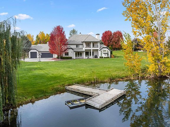 Nestled setting with lakes on both sides in an exclusive Eagle location! Over $40,000 in new interior paint! Spectacular, irreplaceable lot with breathtaking mountain views, the serenity of being just steps from the Boise River, multiple waterways & towering mature trees. Superior custom-designed home offers unparalleled luxury & sophistication. Over 4500sf with endless upgrades such as triple crown molding, rich hardwood floors throughout & abundant windows to take in the breathtaking views. Chef's kitchen is a masterpiece, featuring slab granite counters, custom cabinetry, top-end appliances & spacious pantry. The main-level master suite is a true retreat, boasting a fireplace, walk-in tile shower & clawfoot soaker tub. Upstairs, the balcony provides stunning eastward views of the mountains & overlooks the tranquil water. The oversized 40x28 garage offers ample space. Enjoy full irrigation water rights & 50+ acres of surrounding open space.