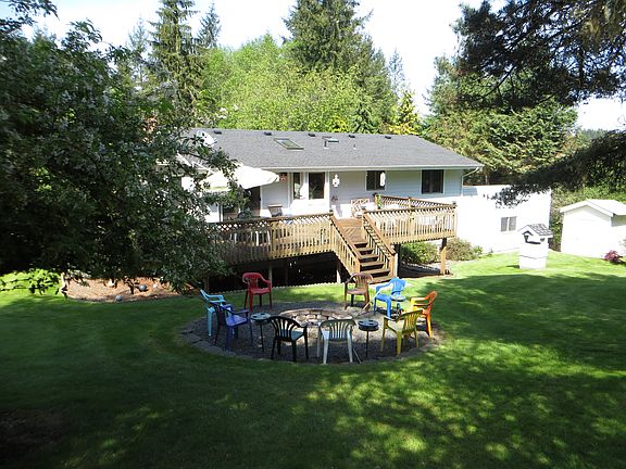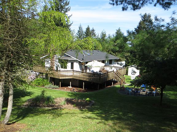 Secluded park-like property & wonderful home. Oak flooring on main floor & maple flooring from the highschool gym downstairs. Better than new, with numerous recent updates including: roof; HardiPlank siding; wood framed & bay windows; granite counters; electric skylight. There are blueberries, plum, cherry, and walnut plus many decorative flowers/shrubs. In addition to the large attached 4 car garage/shop (with 220 & plumbed for air compressor), there is a separate 24'x40' RV barn & RV dump. The downstairs party room has a wet bar & fridge. Expansive wrap around decks, year round fire pit & wishing well. This home and property are in excellent condition - just move in and enjoy it!