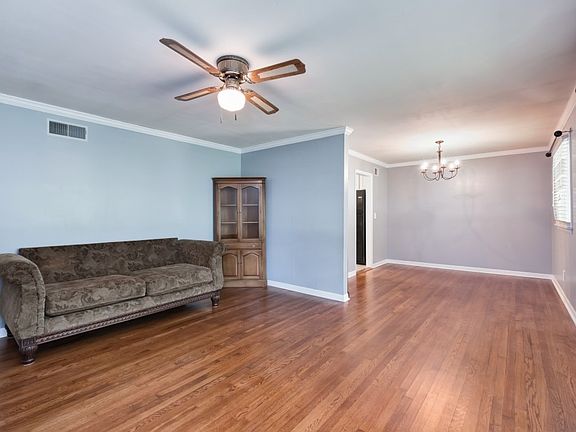 This adorable home is located in a super convenient neighborhood close to everything. The covered front porch greets guests with charming street appeal. Beautifully refinished hardwoods run throughout most rooms. Lots of fresh paint, smooth finish ceilings, ceiling fans and crown mouldings in all rooms. Spacious eat-in kitchen has white cabinets and newer stainless steel stove and microwave. Open concept family room makes for easy conversation and great flow for entertaining. Family room exits to a rear concrete patio and fully fenced yard. Outdoor spaces are private and lush with plenty of mature trees. Large indoor laundry room doubles as terrific pantry space for dry goods.