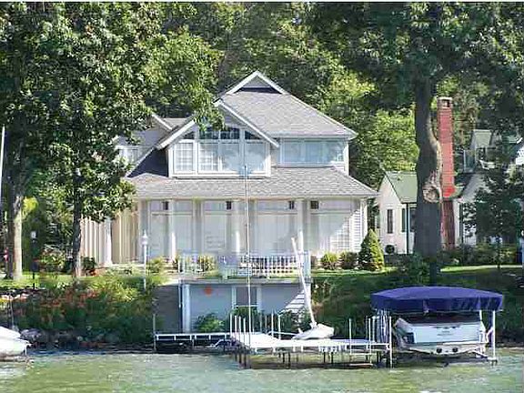 Rare Opportunity! Over 1/2 an acre at the lake! Contemporary Wawasee Lakefront home on Eli Lilly Rd! 50' Frontage. Enjoy gorgeous sunrises & sunsets! Built in 97', this beautiful home was made with entertaining in mind. Pella sliding glass doors surround the lakeside Great Room (includes Dining/Wetbar, Living Rm w/built-ins & Kitchen w/island). 4 bdrms, 3.5 baths, 2,775 sq ft, Main & Upper Level Suites, wrap around porch, detached garage w/guest room, lg. back lot, pier & more! Ceramic Tile