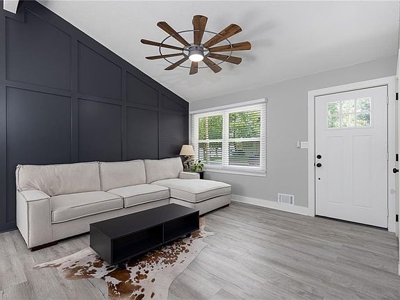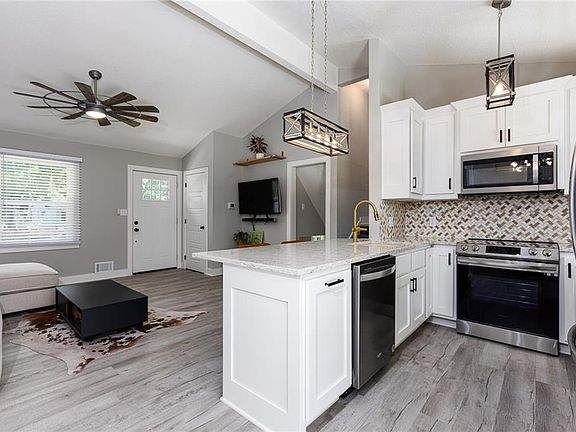 Absolutely stunning and QUALITY remodel!  Through the front door you are greeted with an open and airy living/kitchen/dining space that offers LVT flooring, vaulted ceilings, gorgeous accent wall, windmill ceiling fan, kitchen that boasts custom cabinets with soft-close drawers and doors, quartz counters, stainless steel appliances (induction cooktop, LG fridge stays), tons of counter space plus breakfast bar!  Spacious, finished walkout basement offers plenty of space to spread out and entertain with a wetbar and NEW full bathroom!  Adorable and LARGE (24x11) shed with loft space has tons of storage space and ready to be transformed to the he shed/she shed you've been dreaming of!  Extra deep garage with bluetooth opener.  New slider installed off kitchen that walks out to large patio plus basement walkout as well!  All new bathrooms with tiled showers, fresh interior and exterior paint, NEW windows, HVAC, water heater and electrical, newer roof and so much more!!  Truly a turn-key property, nothing to do but move in!!  Located on nearly 1/3 acre, fenced and treed (some fruit trees, YUM) lot on a quiet street within the Park Hill School District.  Close proximity to major highways, shopping, schools, restaurants and just minutes from the new airport and downtown KC!
