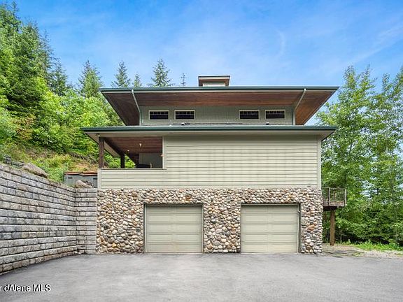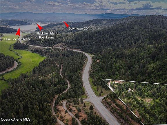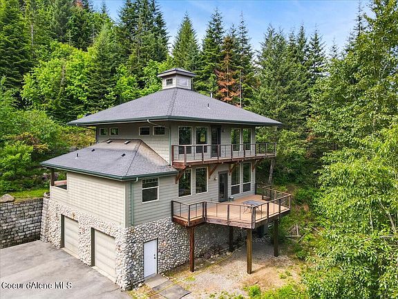 This beautiful custom home on 6.61 private acres is only 5.6 miles from the Coeur d'Alene resort and all downtown CDA has to offer. 4 miles away from the Blackwell Island boat launch to get on the Spokane River and lake Coeur d'Alene in a matter of minutes. The open floor plan, vaulted ceilings, and huge windows absorb tons of natural light and bring nature home in a dramatic way, literally feeling like a treehouse in the woods. Enjoy multiple levels of outdoor wrap around deck space and expansive views, including a sliver of lake Coeur d'Alene from the second level balcony with access off the main suite. Relax in the jetted corner tub in the en suite bathroom with large windows and tranquil forest views. The private driveway provides room for RV and boat parking, and there is space for a future shop with power and water close by. Well has a 3,000 gallon holding tank near the home. Incredibly rare to find private acreage this close to town!