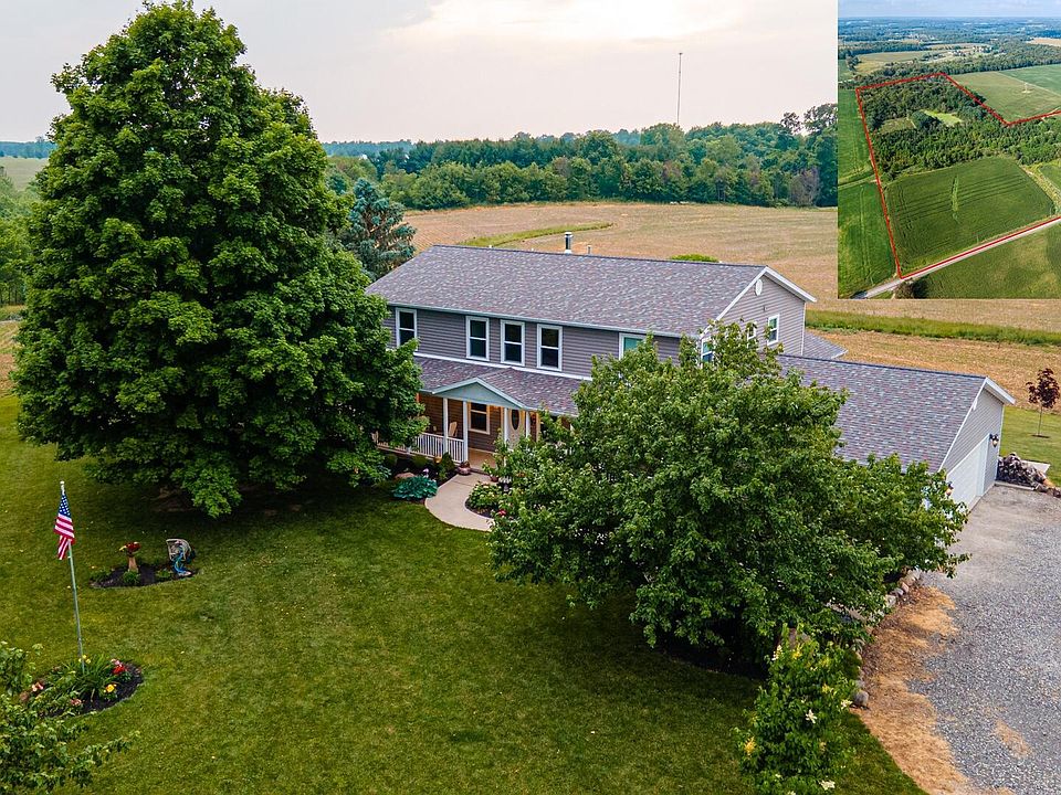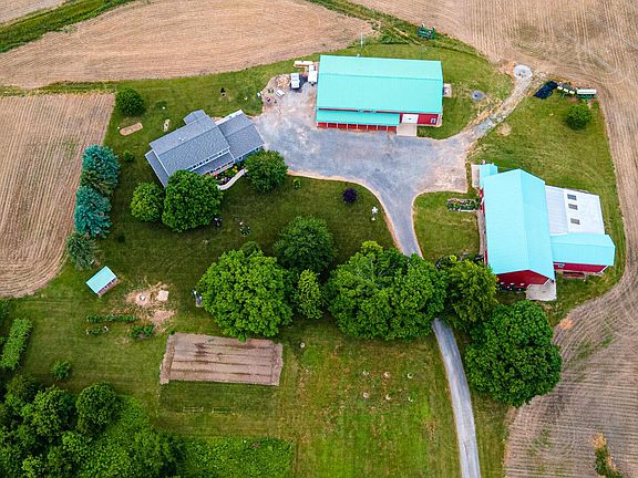 LIVE THE DREAM on 60+ secluded acres! Easy access to I71 and only 35 min away from Polaris. Indoor space includes a newer custom built farmhouse, a 50x100 finished pole barn and a 40x80 historic bank barn. The home features 7 beds, 3.5 baths, open living space, gas fireplace, dual zone hvac, a finished walk up basement w/ 2 bonus rooms, and an oversized 2 car garage. The pole barn is divided into 4 bays w/ zoned hvac, laundry, office, and 1.5 baths, plus a warehouse with 12' garage doors and 15' ceilings. The upper level includes a 1 bed, 1 bath efficiency! The 1830's barn is a gem on its own! New siding in 2022. Currently used for farming purposes, has a chicken coop, water and electric. The land boasts 40+ acres of woods, 1.5 acre pond, pine and walnut groves, and varied fruit/nut trees. Amazing hunting opportunities along with walking trails carved throughout. Tons of potential to run a thriving business, maybe a retreat, wedding venue, or campsite? Endless potential, A MUST SEE!