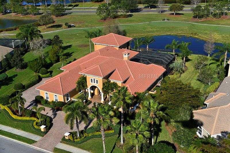 This exquisite custom estate home was designed by Anchor builders and is located on the most prestigious street in Lakewood Ranch Country Club. This masterpiece boasts awe-inspiring rich details throughout. Glorious golf course and lake view. Offering four spacious bedrooms, sparkling marble floors, two cozy fireplaces and Corinthian columns in the entry way. There is a charming wet bar off the living room for entertaining your guests. Dazzling metallic backsplash that truly pops in the room. Desirable gourmet kitchen fit for any true chef featuring a grand prep island with veggie sink, granite surfaces, a Viking 6-burner cooktop, Sub-Zero, Viking & Bosch appliances, pasta pot faucet, and ice maker. Enjoy maple designer cabinets, a hidden walk-in pantry and a magnificent wine cellar with iron gate. This home affords numerous tray ceilings with uplighting and crown moldings. The family room is complete with built-ins and surround sound with many systems Smart Home. A luxurious owner's suite with bath offers a garden Jacuzzi tub, unique his and hers private areas and massive walk-in closets with dressing area. Grand bonus room retreat. An alluring resort-style lanai with fireplace and four covered areas with wood ceilings treatments offers an enticing salt water pool and spa, a newer outdoor kitchen and an outdoor shower. CDD fee is included in the taxes.