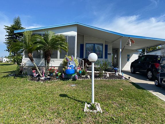 7008 King Palm Court, Ellenton FL. 34222 Ridgewood Estates 55+ Pet Friendly Community This home is on a rented/leased Lot Come check out this beautifully upgraded and maintained 2BR/2BA with a 8'x12' front-set, enclosed lanai. There is a large carport (3cars), a shed and a covered back porch area. This home comes with vaulted ceilings and some sheetrock walls. There is laminent flooring and carpet in all the right places. Some of the recent (2021) upgrades include: a vapor barrier! replaced ductwork! subfloors in hallway, living, kitchen dining, and master bath! Laminent and carpet! Tie downs! Also, the dishwasher and microwave are 2021. The laundry hookups are inside the main home. The washer/dryer is included in the sale. The enclosed lanai has new vinyl windows, carpet and has a portable AC. The kitchen is custom upgraded and detailed. There are Corian countertops and tile backsplash. The cabinet doors and handles are custom. It also has matching stainless appliances. There are separate dining and living rooms. The master bedroom has sheetrock walls, carpet, vaulted ceilings, walk-in closet, and a master bath en suite. The master bath has a single sink vanity, a separate walk-in shower and additional counter space. The guest bedroom is carpeted, has sheetrock walls and a closet. The hall bath has a single sink vanity with upgraded countertop and a shower/tub combo. The lot rent is $841 and includes lawn mowing, edging, and blowing and the community amenities as outlined below. Ridgewood Estates is a well-maintained GATED community with 2 heated pools, a hot tub, shuffleboard & tennis courts, horseshoe pit, pool side club house with a library, fitness center & billiards room. There is also a large "event" center used for many HOA sponsored events. Cards, Bingo, Chair Volleyball, water aerobics.... just to name a few