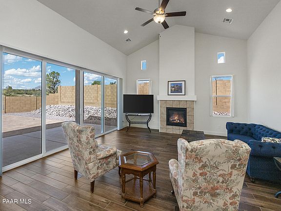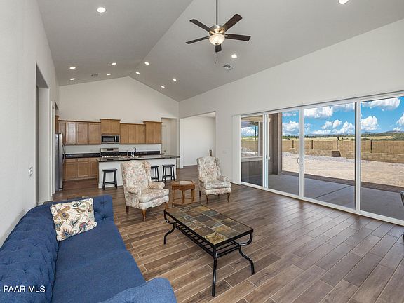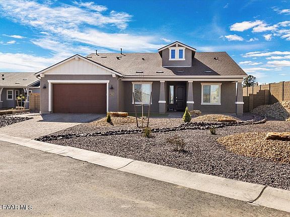 Experience the epitome of this better-than-new Dorn Home set on a premium, elevated homesite in Prescott's Westwood neighborhood. This stunning residence offers sweeping panoramic views of Mingus, Granite and Bradshaw Mountains, Thumb Butte and Glassford Hill, with the added advantage of backing to state land. Upon arrival, you'll be captivated by the exceptional curb appeal, boasting meticulously maintained, low-maintenance landscaping, paver driveway, and a vibrant touch of artificial turf. The attractive stucco exterior complements the home's overall aesthetic while requiring minimal upkeep. Step inside this immaculate dwelling, still covered under the builder's warranty, and be greeted by pristine upgraded wood-plank porcelain tile flooring, enhancing the home's elegance.